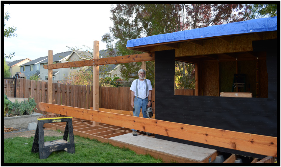 Framing the deck, trellis, and bear shed, Wyatt & Nikki Chamberlin Residence, Newburg, Oregon, USA, 2015.