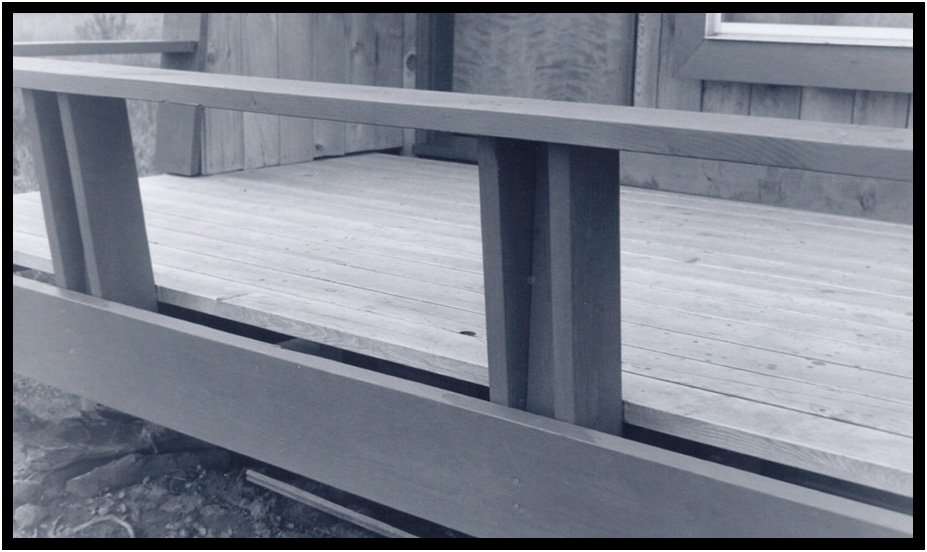 Main cedar deck with seat/handrail, Turnstone Cove I, Yachats, Oregon, USA, 1971.