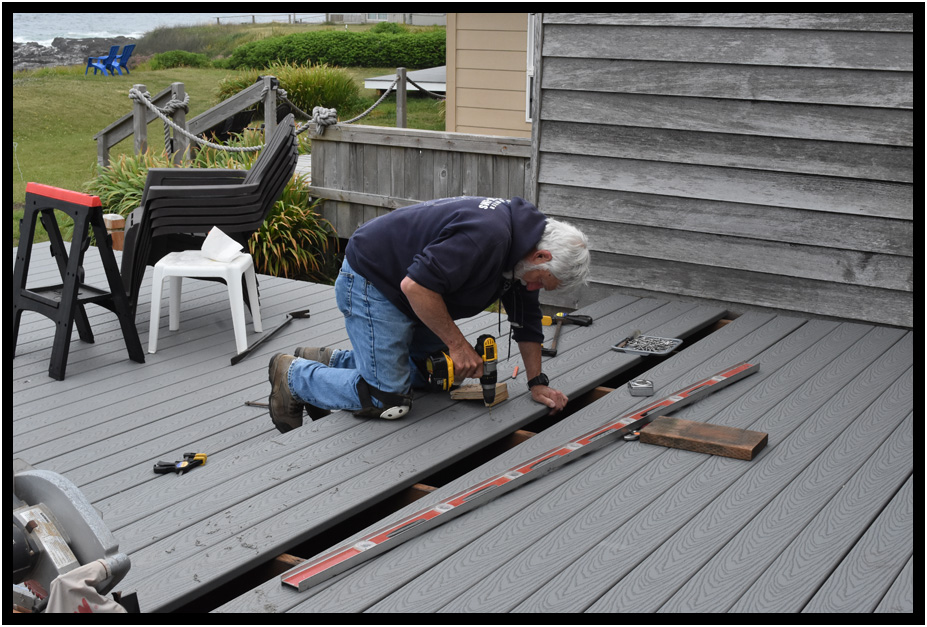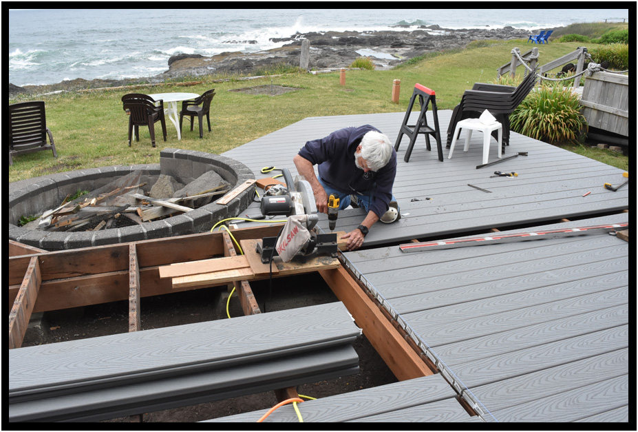 Installation of new vinyl deck, Turnstone Cove, Yachats, Oregon, USA, 2018.