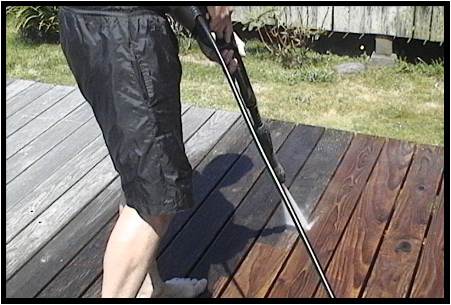 Pressulre washing the cedar deck to restore the surfaces, Turnstone Cove III Residence, Yachats, Oregon, USA, 2015.