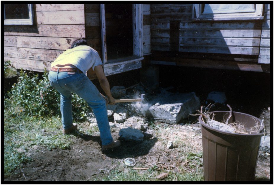 Breaking up the old door stoop, Seashadows Studio, Yachats, Oregon, USA, 1985.