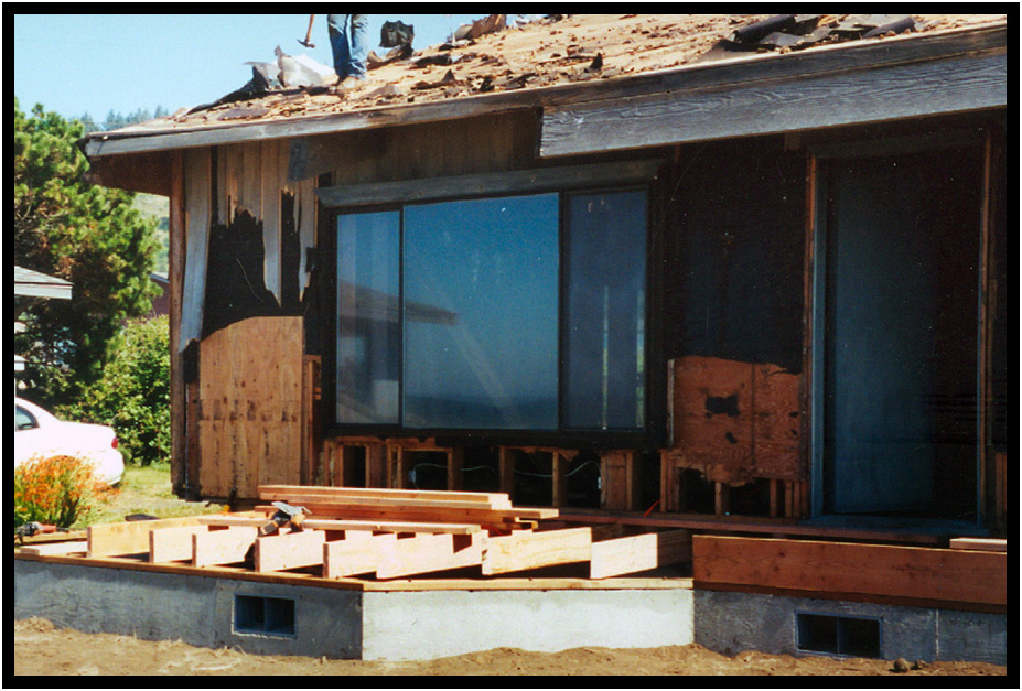 The old picture window wall in the process of demolition even while the new foundation and floor are going in,Turnstone Cove III Residence, Yachats, Oregon, USA, 1999.