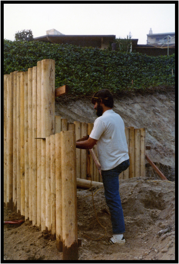 Building a log retaining wall/stockade, Sunhollow House, Burbank, California, USA, 1976.