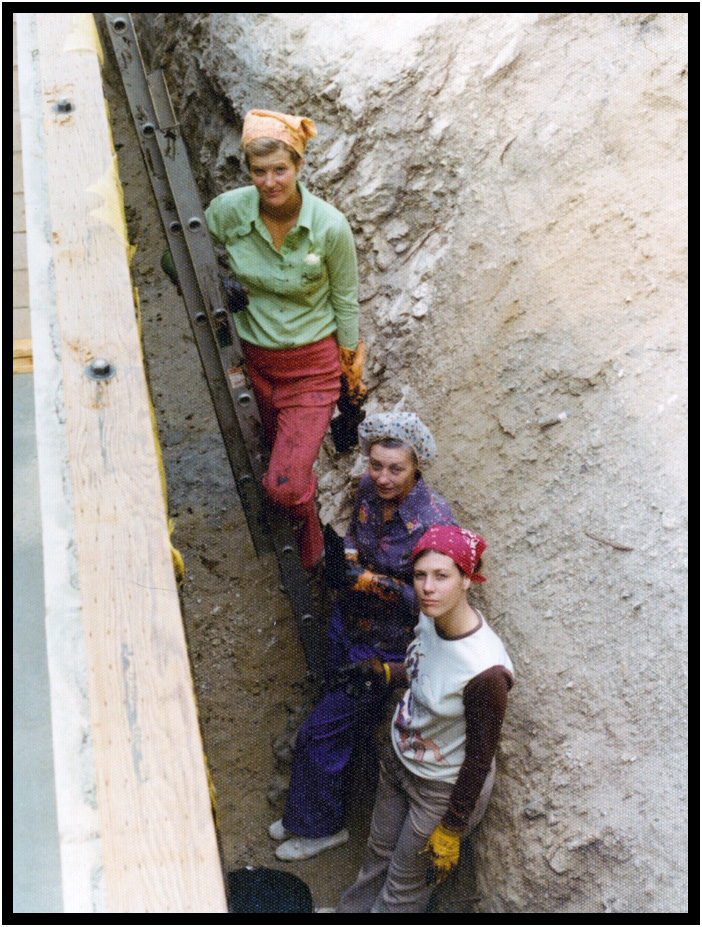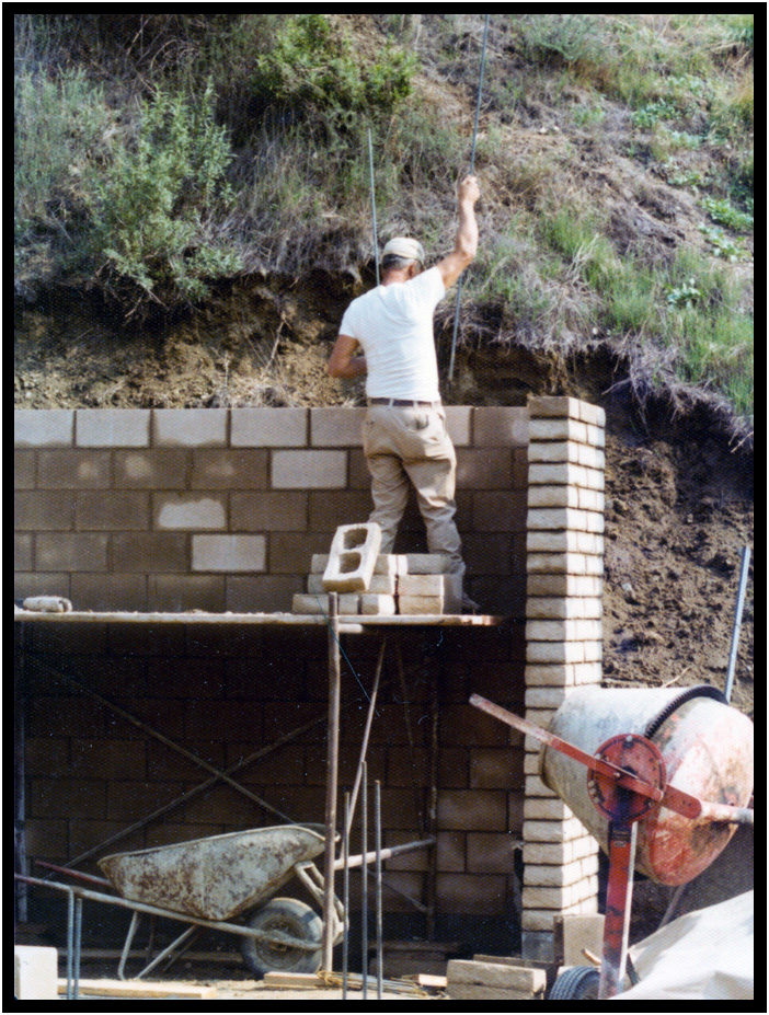 Sub reinforcing retaining wall, Lynn keeping the concrete block grout damp, and Lynn, Ginny, and Joyce applying tar-based waterproofing, Sunhollow Residence, Burbank, California, USA, 1976.