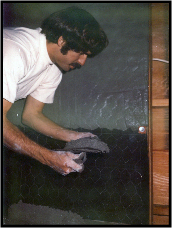 Applying mud base for stone hearth and backing for Danish fireplace, Turnstone Cove I, Yachats, Oregon, USA, 1971.