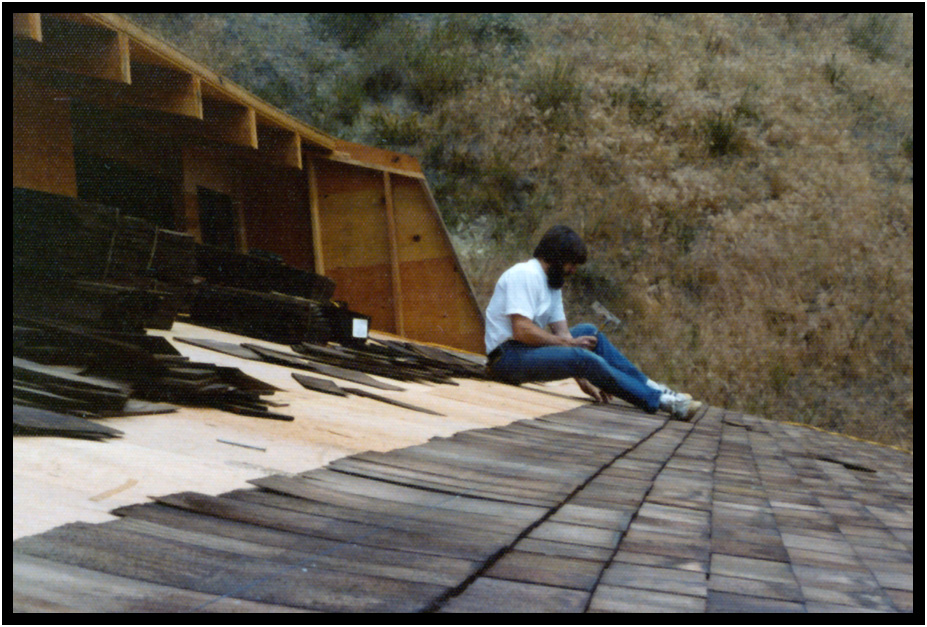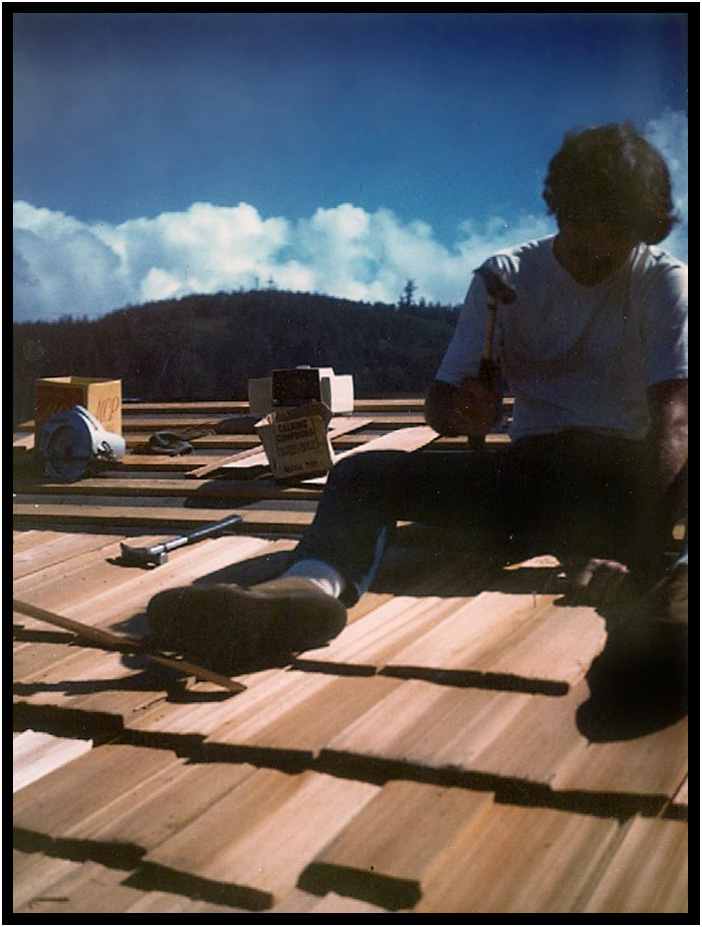 Installing cedar shakes on the roof, Turnstone Cove I, Yachats, Oregon, USA, 1971.