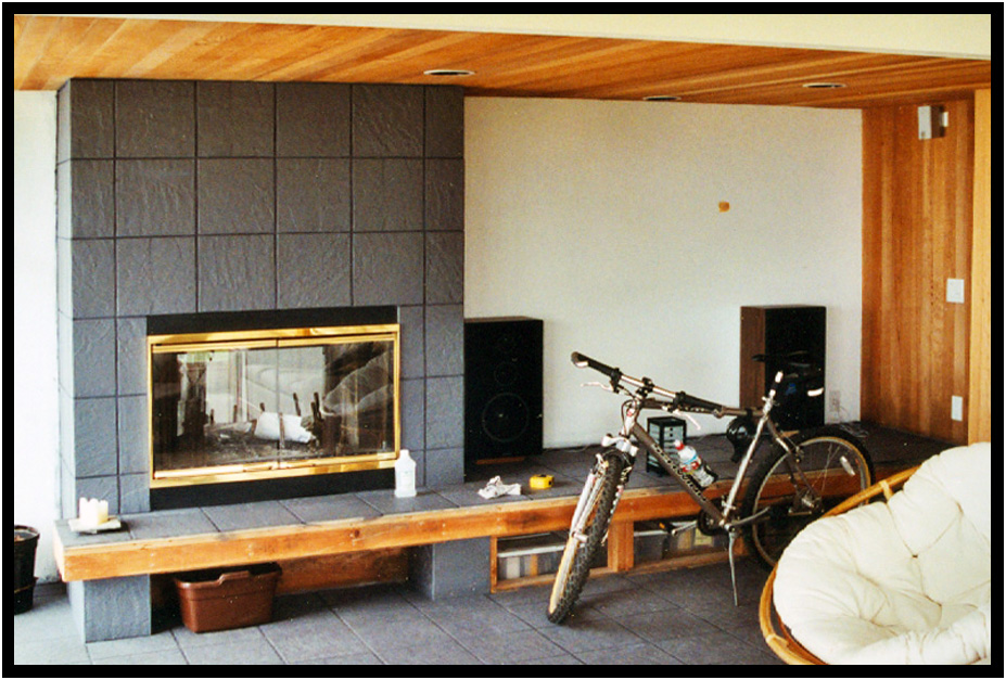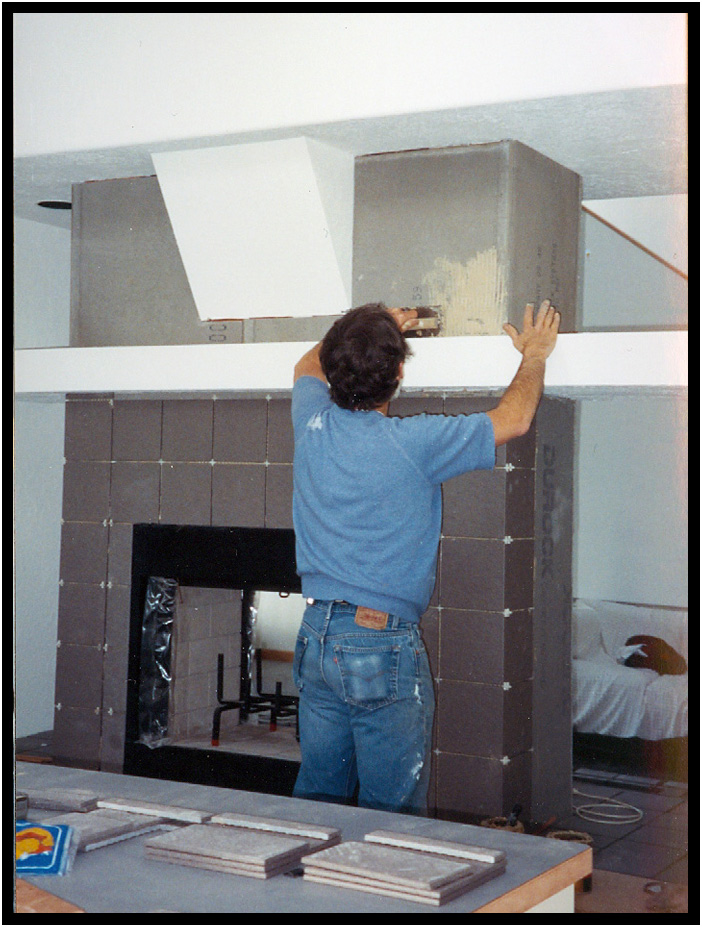 Installing tile on the fireplace in the Greatroom along with the finished grouting, Turnstone Cove III, Yachats, Oregon, USA, 2000.
