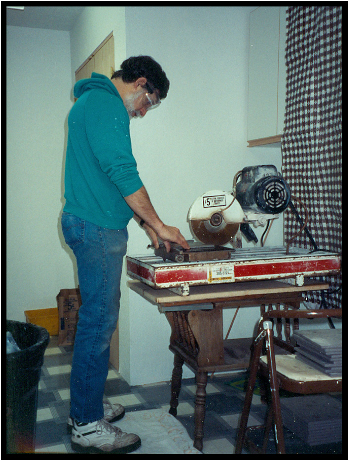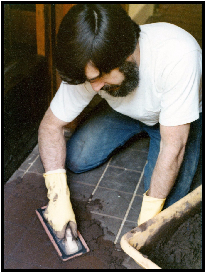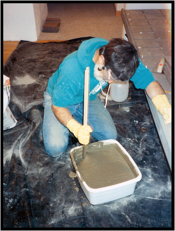 Mixing grout, cutting tile, and installing on fireplace and hearth, Driftwood Residence, Yachats, Oregon, USA, 1989.