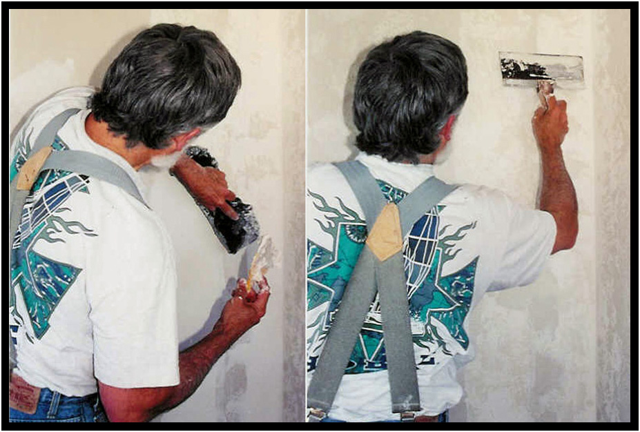 After hanging 5/8" type-x drywall, a rough knock-down texture is applied, Driftwood Residence, Yachats, Oregon, USA, 1989.