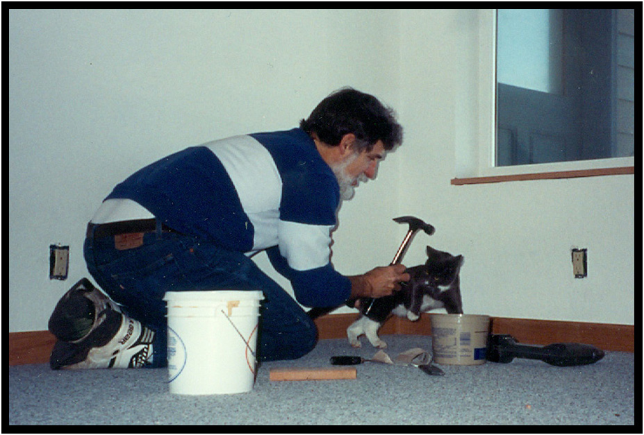 Shadow helps with the finish carpentry oak base board, Driftwood Residence, Yachats, Oregon, USA, 1989.