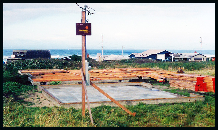 First floor framing following the concrete foundation contractor, Driftwood Residence, Yachats, Oregon, USA, 1989.