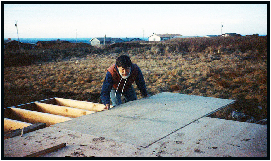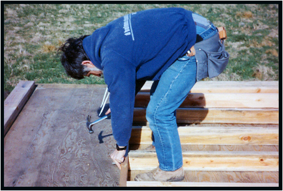Laying the 1-1/8" t&g plywood subfloor, Driftwood Residence, Yachats, Oregon, USA, 1989.
