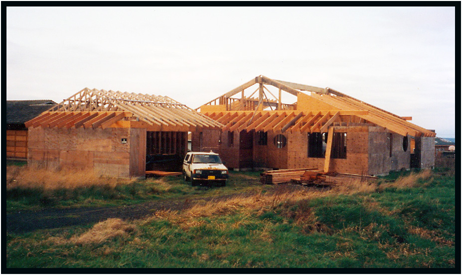 House awaiting last ceiling joists and sheeting, Driftwood Residence, Yachats, Oregon, USA, 1989.