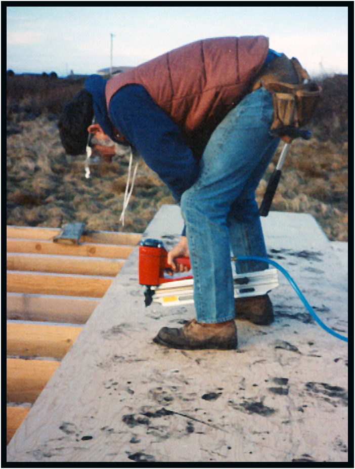 Using a nail gun to fasten the subfloor, Driftwood Residence, Yachats, Oregon, USA, 1989.