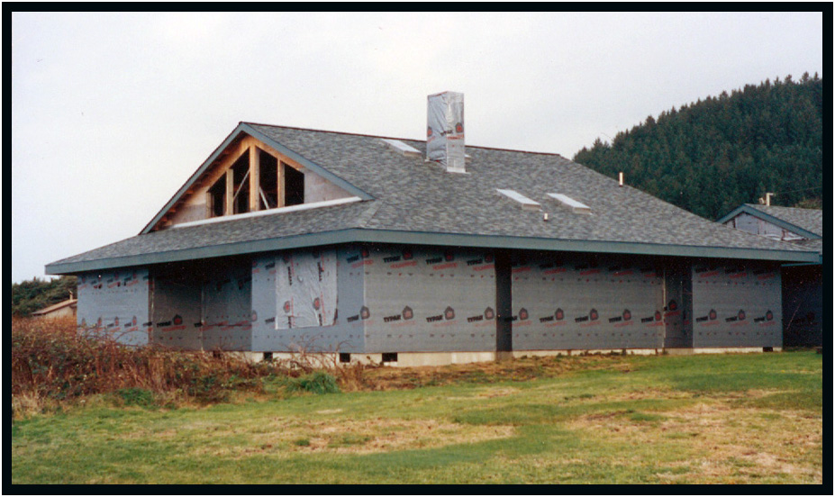 Framed structure wrapped in Tyvek moisture barrier, Driftwood Residence, Yachats, Oregon, USA, 1989.