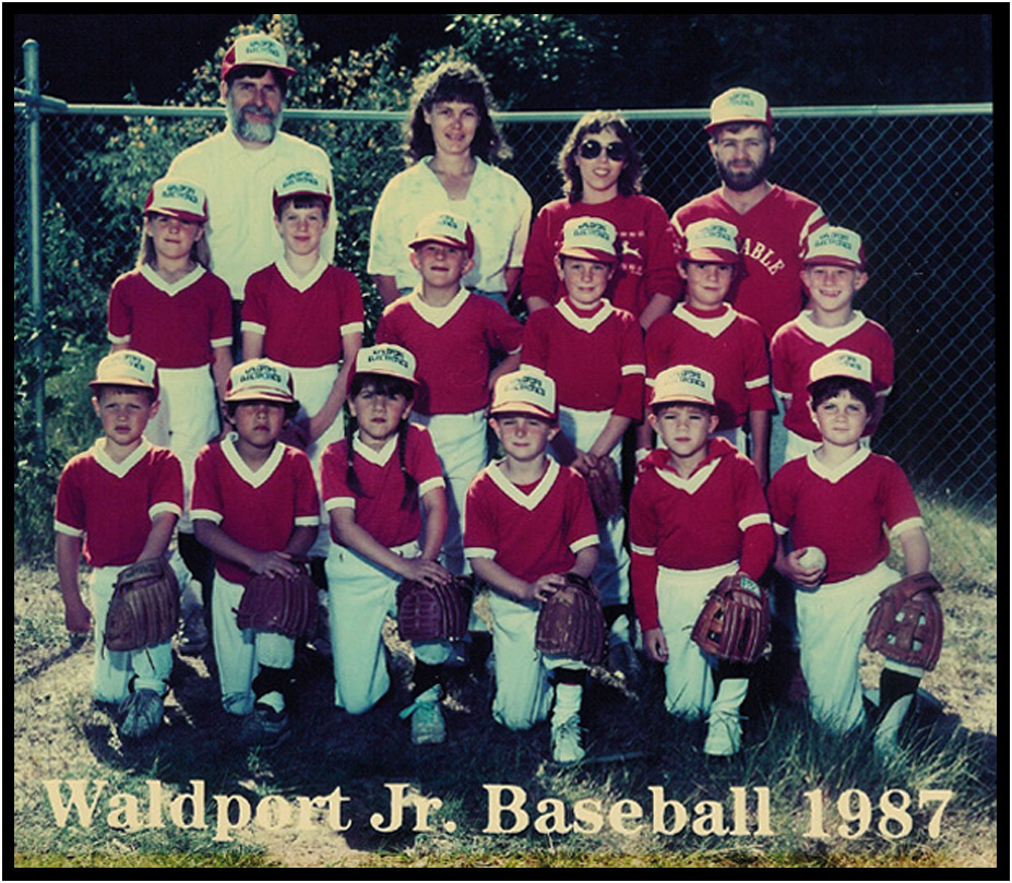 Coaching sons Wyatt and Ryan in junior league baseball with Lavonne Olsen and Robin and Jay Morris, Waldport, Oregon, 1987.
