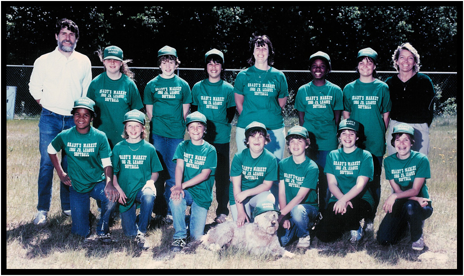 Coaching girls softball team with Lynn Chamberlin and Lynn Hanley, Waldport, Oregon, 1985.