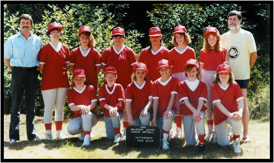 Coaching girls softball with John Hanley, Waldport, Oregon, 1988.
