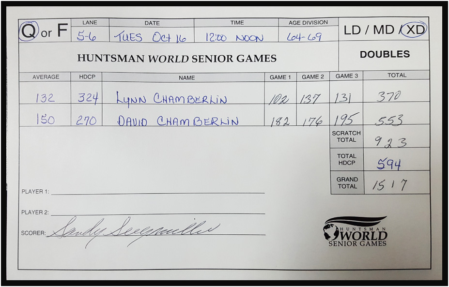 One of my best scorecards was for mixed doubles at the 2018 Huntsman World Senior Games, St. George, Utah, 2018.