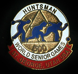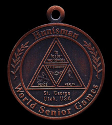 Gold, Silver, and Bronze medals and a 500 series pins won at the Huntsman World Senior Games over the years, St. George, Utah.