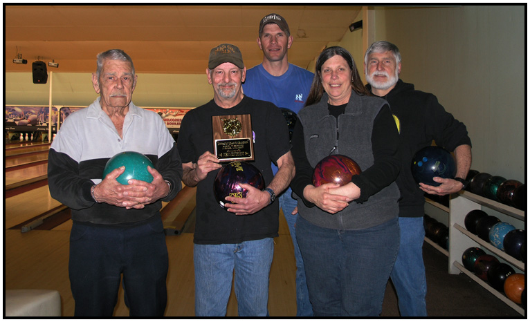 (L to R) Don Overly, ?, Troy Stout, Lynn Chamberlin, Dave Chamberlin. Don is a Pearl Harbor survivor and over 90... still an excellent bowler.