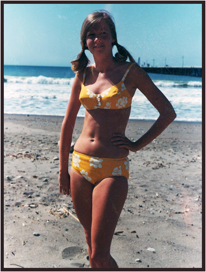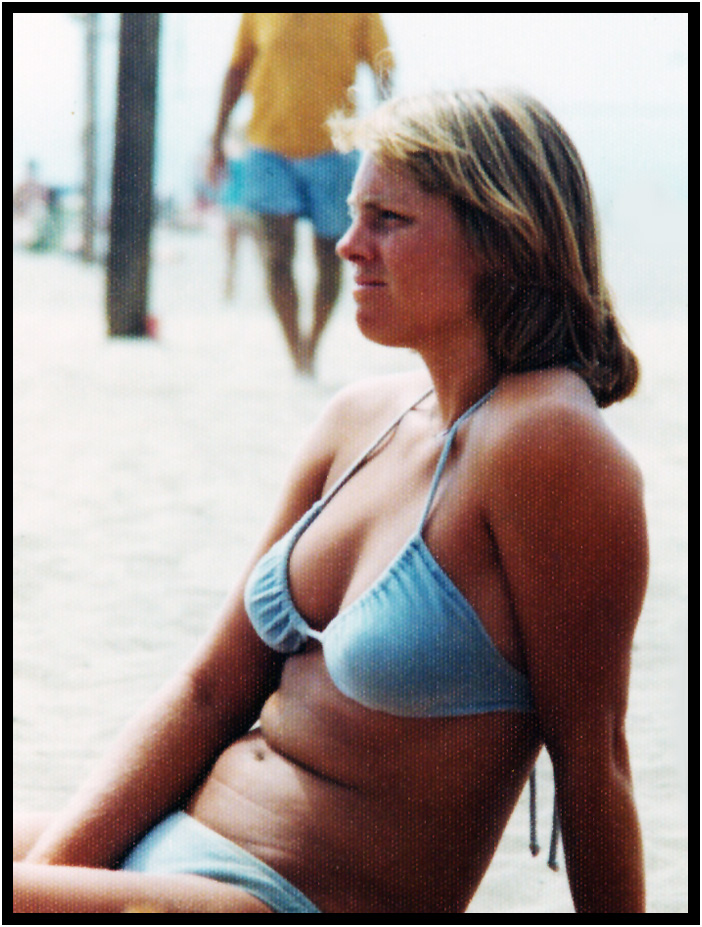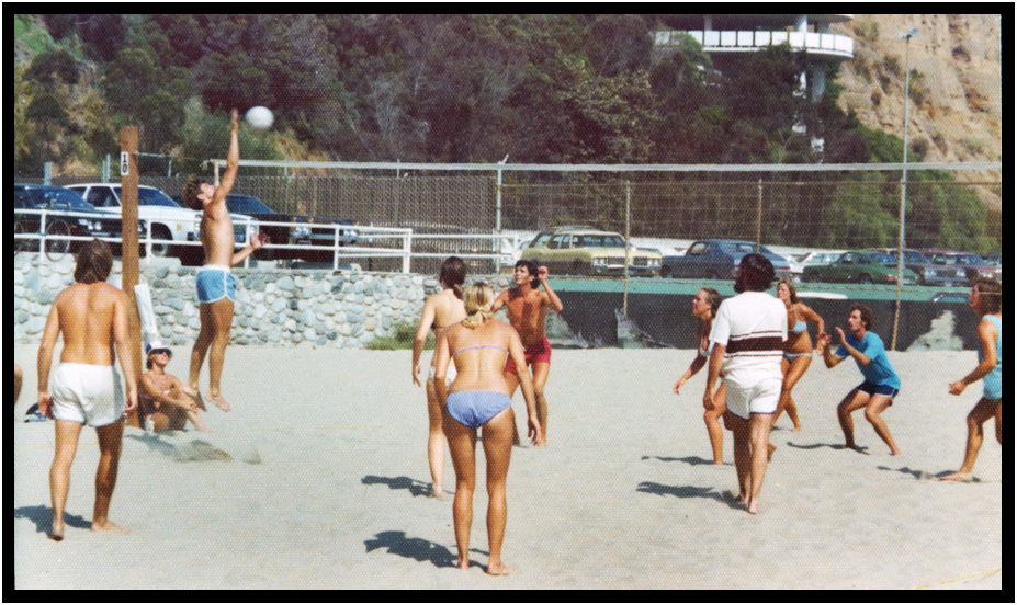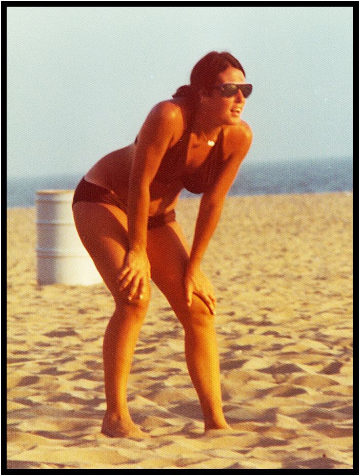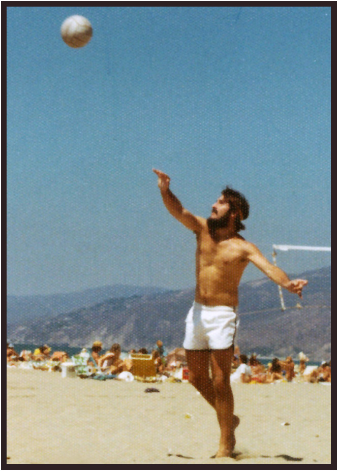 Spiking the ball at a beach birthday party for Rose Rahn, State Beach, Santa Monica, California, 1976.