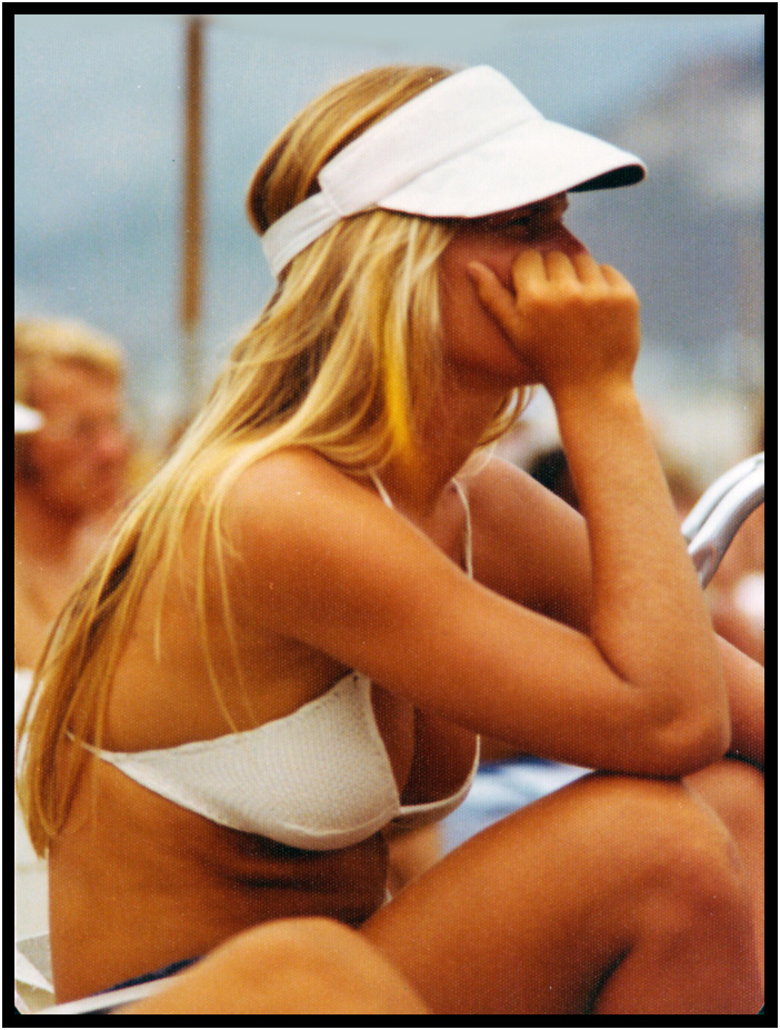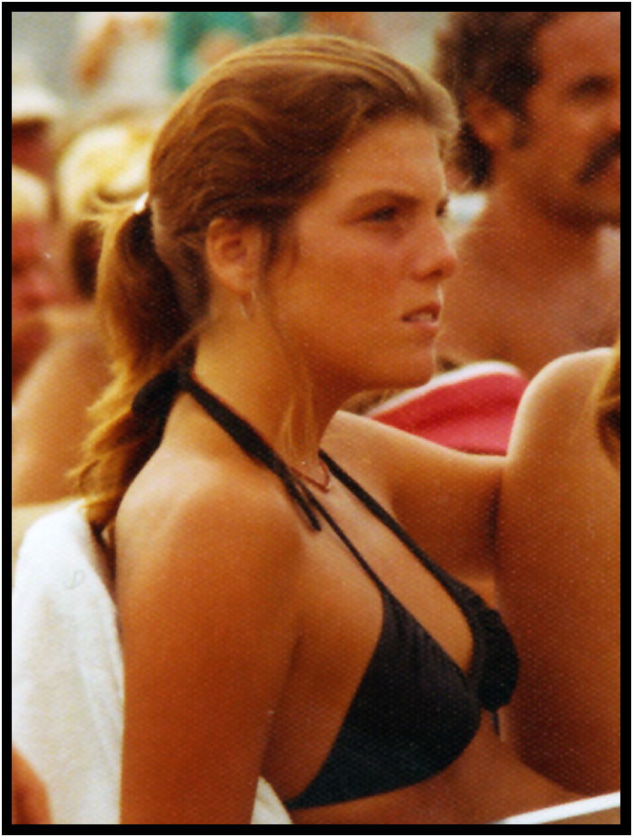 Serving the ball at a beach tournament, Sorrento Beach, California, 1976.
