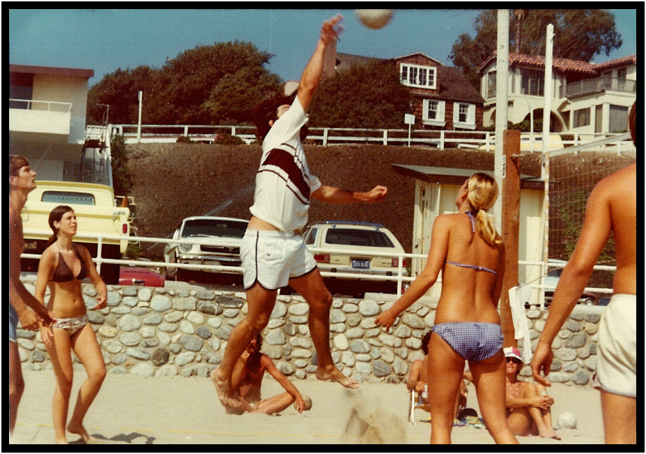 I played most of my Men's beach tournaments with Mike Henry, shown here spiking the ball, Sorrento Beach, California, 1976.