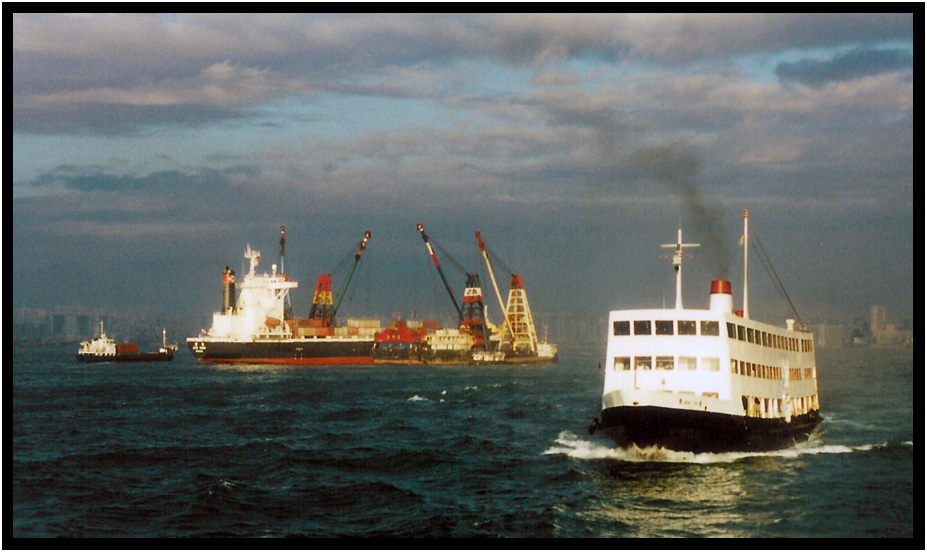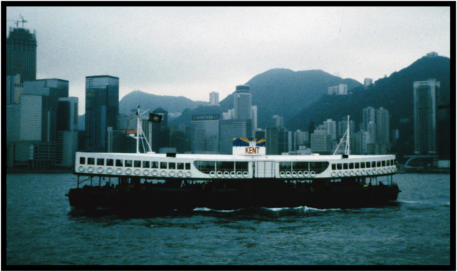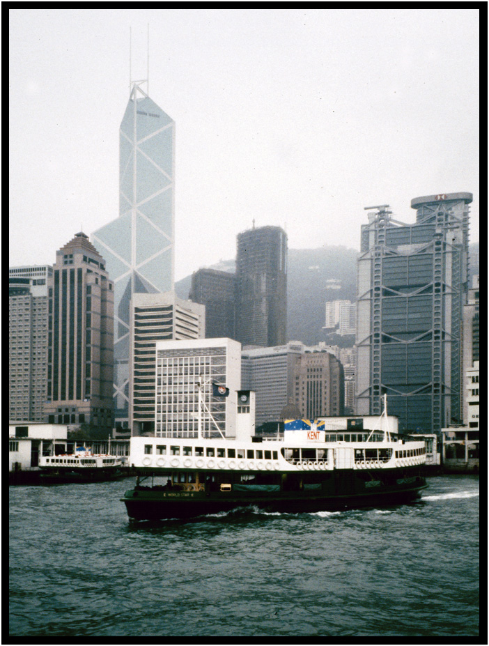 The Star Ferry against the backdrop of busy Hong Kong Island, Hong Kong, China, 1991.