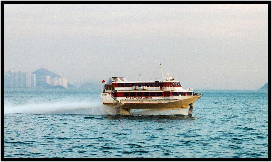 One of many hydrofoils rapidly transporting customers island to island, Hong Kong Harbor, Hong Kong, China, 1998.