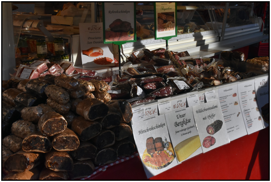Deli meats, marketplace, Salzburg, Austria, 2017.