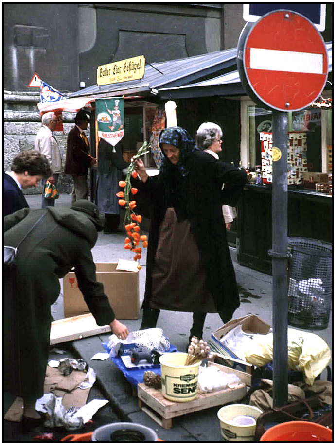 Flower seller, marketplace, Salzburg, Austria, 1984.