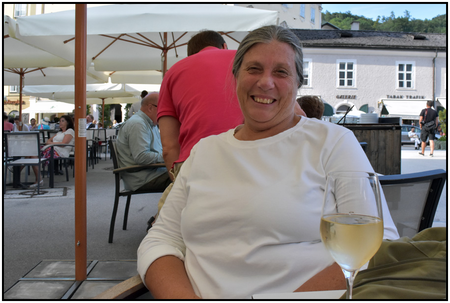 Lynn enjoying some wine in the shade, Mozartplatz, Salzburg, Austria, 2017.