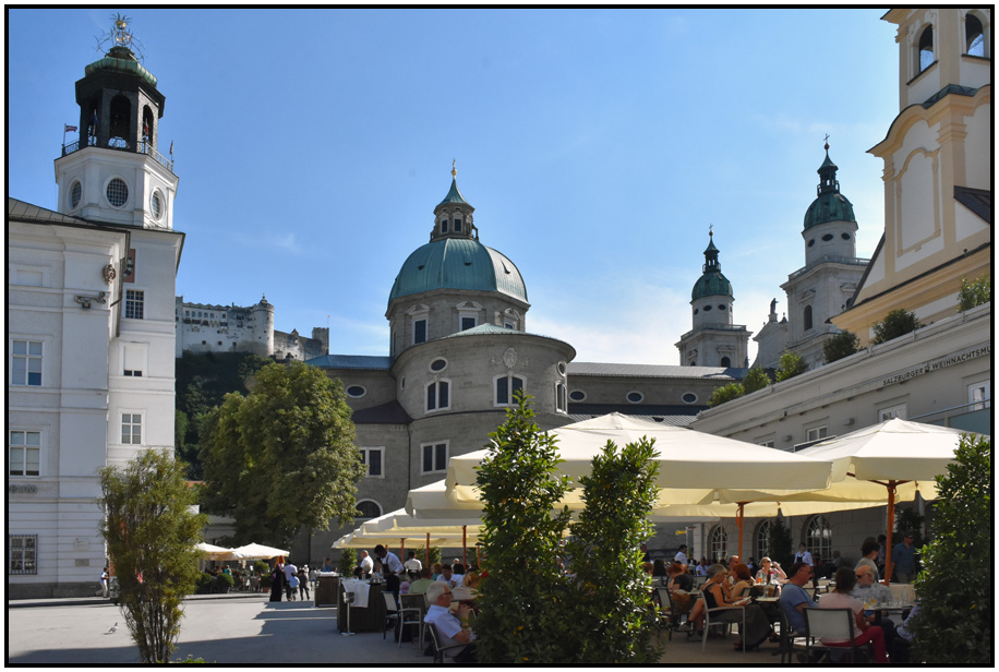 Patio restaurant with New Residence and Salzburger Dom in the background, Mozartplatz, Salzburg, Austria, 2017.