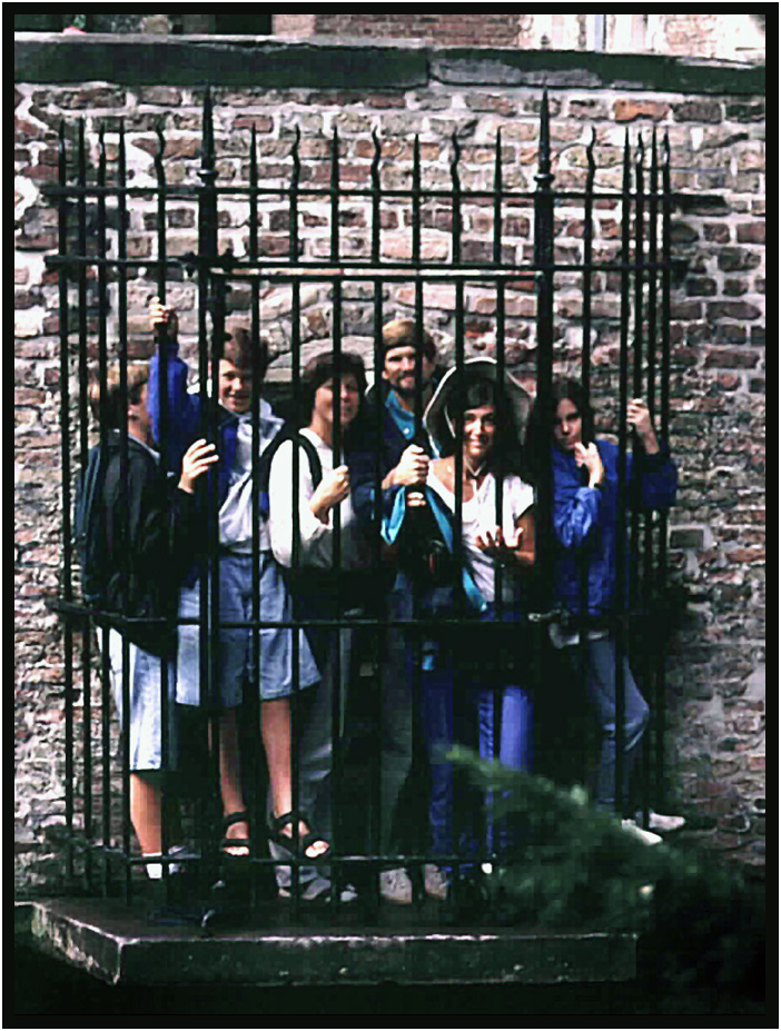 Our travel group, Rose, Ken, Bree, Lynn, Wyatt, and Ryan, behind bars, Brugge, Belgium (1994)