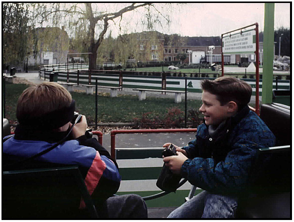 Wyatt and Ryan ride the tram toward the caves, Hansurless, Belgium, 1991.