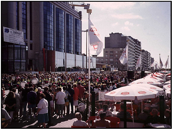 Weekend crowds gather to hear the band on the boardwalk, Zeebrugge, Belgium, 1994.