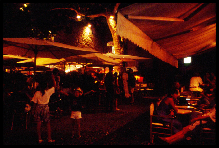 The patio restaurant in a city square where we ate dinner after the long, long show, Carcassonne, France, 1994.