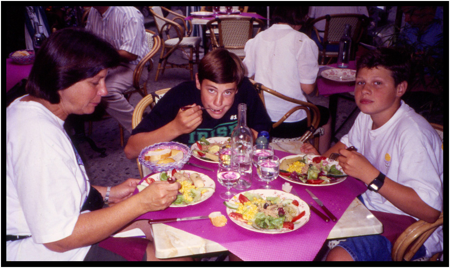 Our late dinner of salad, Carcassonne, France, 1994.