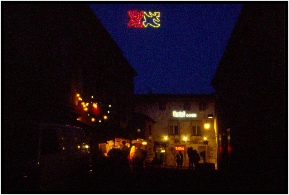 Night street scene with our hotel at the end, Carcassonne, France, 1991.