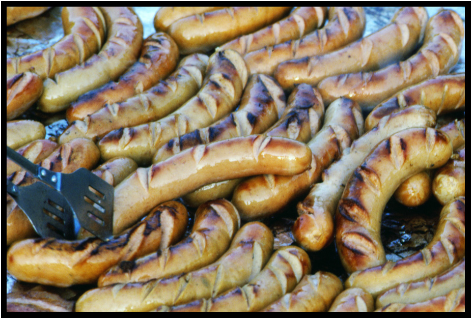 Bratwurst taste best grilled over an open fire, Brettach, Baden Wurttemberg, Germany, 1984.