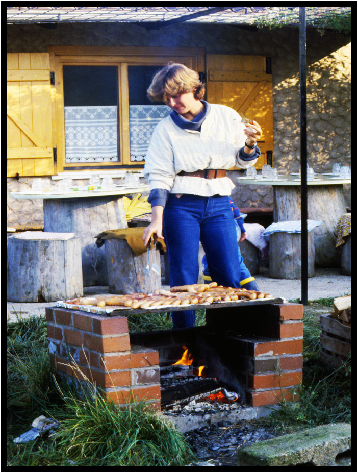 Joyce overseeing the Bratwurst on the grill, Brettach, Baden Wurttemberg, Germany, 1984.