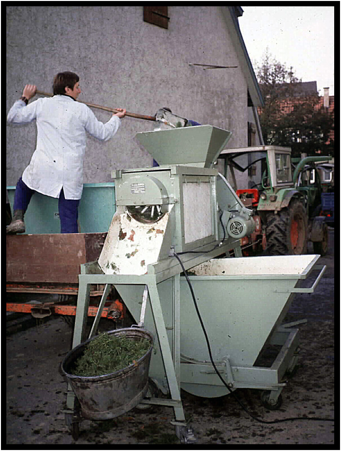 The processing of the wine grapes begins with de-stemming at the communal machine, Brettach, Baden Wurttemberg, Germany, 1984.