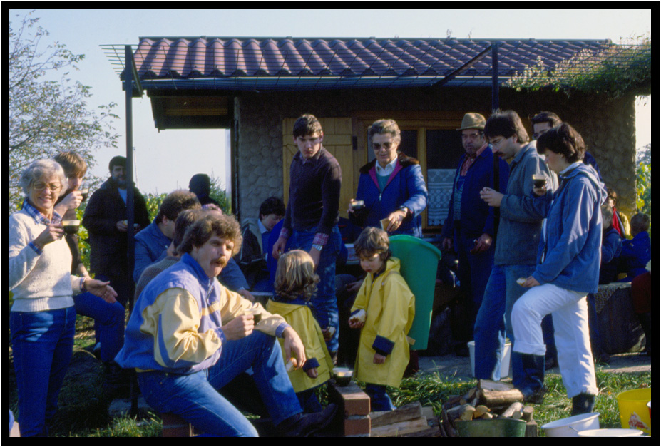 The extended family and friends gather for bratwurst and cider, Brettach, Baden Wurttemberg, Germany, 1984.