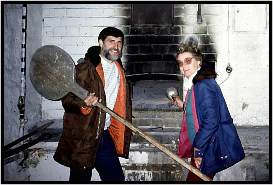 Our host, Gretchen, shows us the communal ovens where everyone schedules to bake bread, Brettach, Baden Wurttemberg, Germany, 1984.
