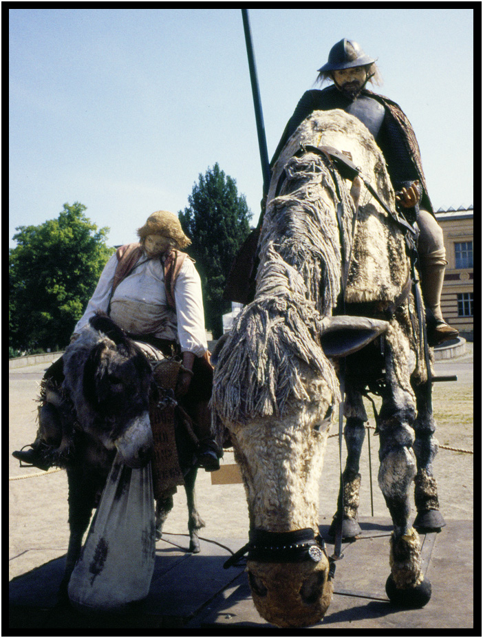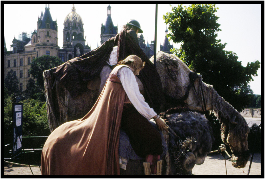 Artsy rendition of Don Quixote and Sancho Panza in front of the Staatstheater, Schwerin, Germany, 1994.