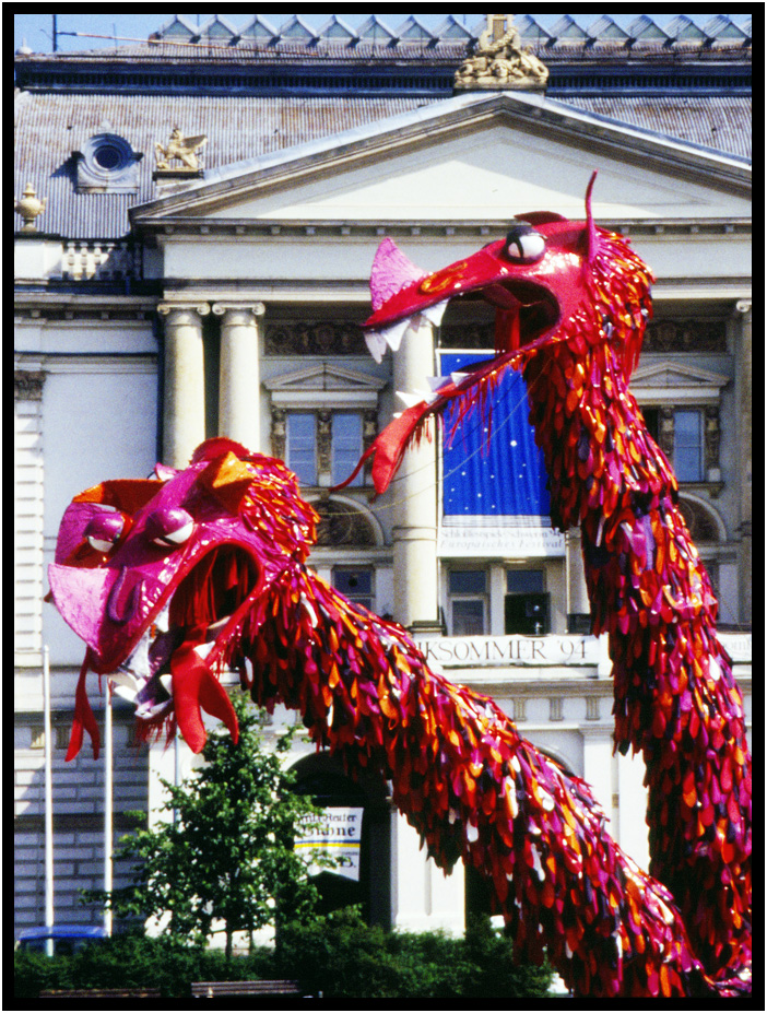 Artsy rendition of dragons in front of the Staatstheater, Schwerin, Germany, 1994.