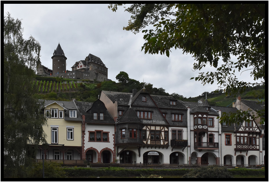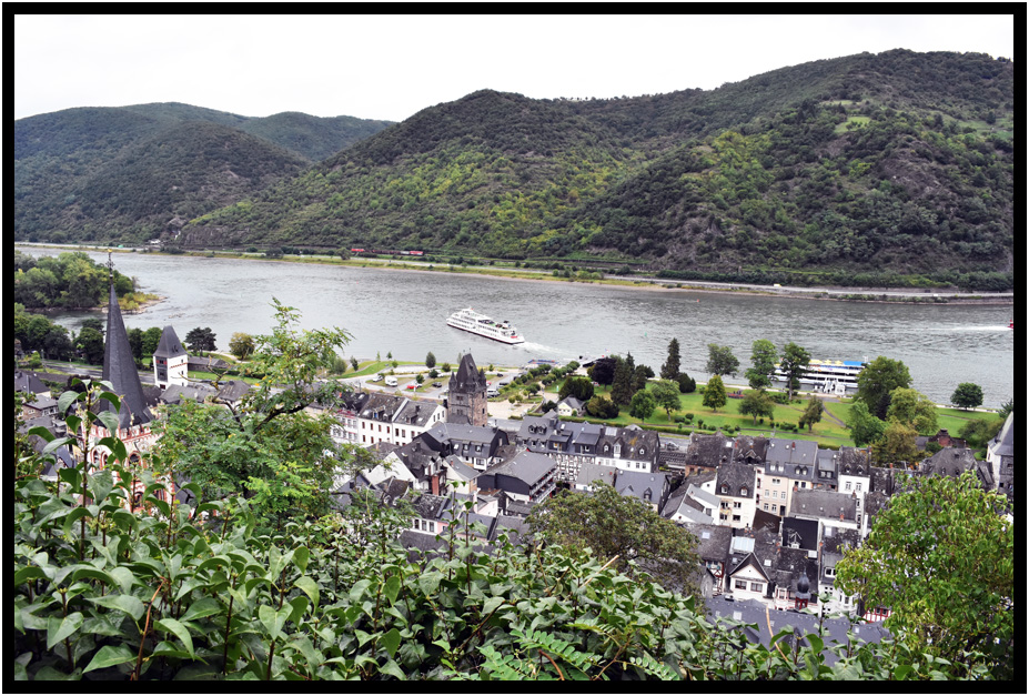 Bacharach huddles along the banks of the Rhine between the railroad tracks and the castle on the steep hillside above.