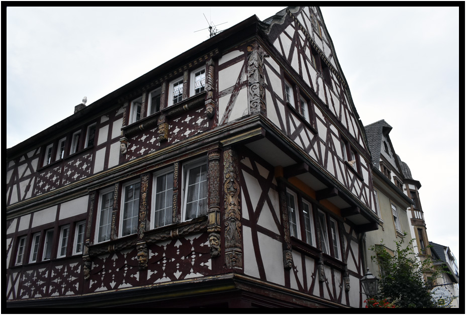 Half-timber architecture with intricate carvings, Boppard, Rhineland Palatinate, Germany, 2017.
