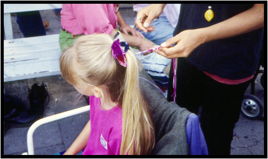 Hair braiding with beads, Kieler Woche, Kiel, Schleswig-Holstein, Germany, 1994.